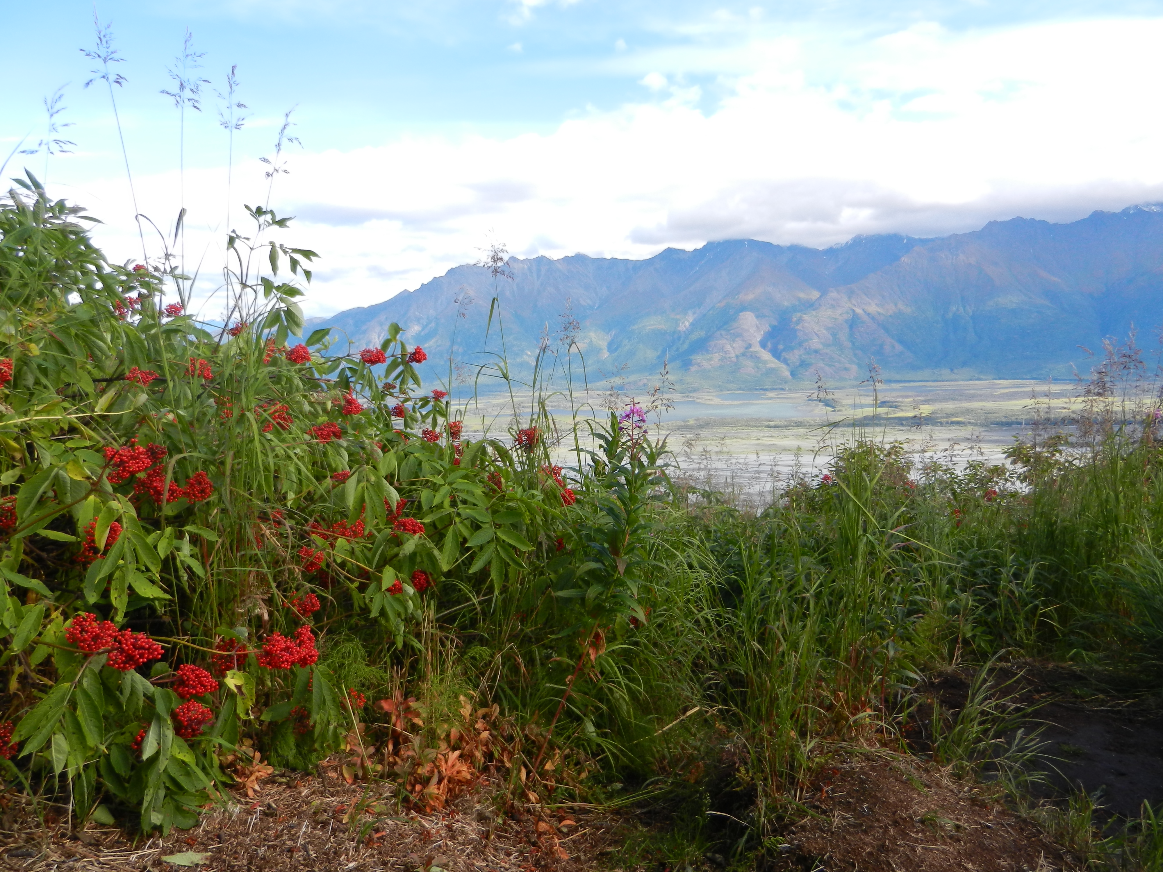 The long, circuitous route to the shoulder of Pioneer Peak begins on the banks of the Knik River, which in case your Alaskan geography is a bit rusty, means we were starting pretty much at sea level–okay, 200 feet. Basically sea level. The first two miles are a long, decidedly uphill slog through sometimes ankle-deep mud, and it’s so densely wooded that it was kind of like walking through a tunnel. For a place that has a reputation for being a barren wasteland, you’d be surprised at the variety of flora here. During this stretch, I prattled endlessly about the various edibles (maybe) that I’ve been taught to identify: “Those are high-bush cranberries, and they have a weird smell. I’m pretty sure you can eat them, but they also look just like a berry you’re not supposed to eat; I forget what the difference is–something about the leaves, maybe?” Kevin is extremely tolerant and, for reasons I cannot explain, managed to feign interest for several minutes before his eyes glazed over and he went to his happy place. Lucky usually peed on whatever plant I was attempting to identify.