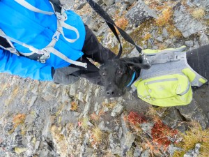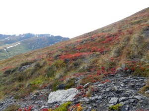 The flora shrank as we climbed higher, and eventually the only thing to see were these beautiful red shrubs. Also, Lucky is reminding me, pika. Lucky is an excellent pika hunter, and though he has never personally caught one, he assures me that if I would just take off his leash (and doggie backpack) for a minute, he would have no trouble digging one out of its little pika den. He is alert (obnoxious) to the possibility of pika at all times when in the high country.