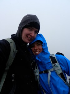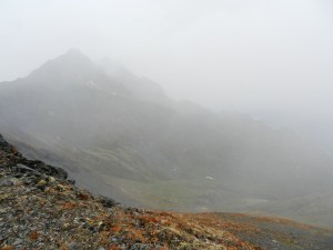 Intrepid climbers that we were, Kev and I stopped long enough to layer up and put on some rain gear, then continued toward the shoulder, where we still hoped for a chance to make the summit. (When no moose are involved, I am at least moderately brave.) Things got ugly pretty fast from there. Within about fifteen minutes (not exaggerating this time), we could hardly see twenty yards in any direction, let alone the peak itself, though we were just 700 feet below its summit.
