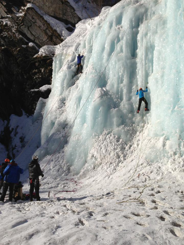 I went over some basics: what kind of knots we use to tie in; front-pointing, or sticking the pointy parts of one’s crampons directly into the ice; and, of course, proper belay technique. Things went mostly without a hitch, and soon everyone was ready to climb. The instructors belayed everyone for the first few ascents, then turned it over to the participants. We were a well-oiled machine.