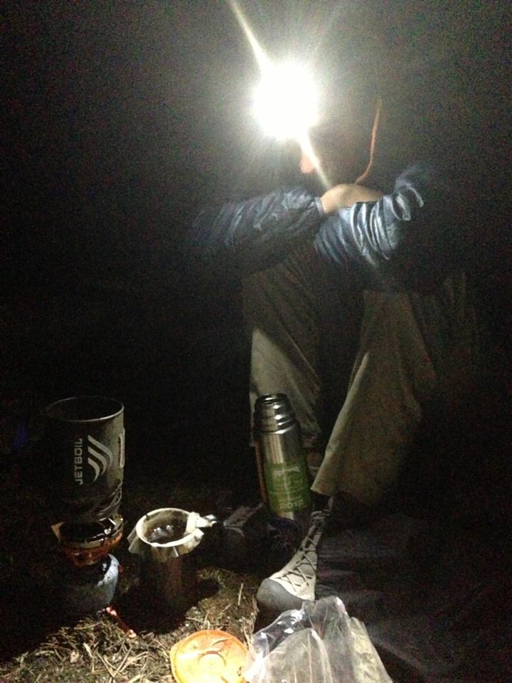 It was pleasant, as bivvies go. We drank the rest of our coffee, shared a bag of politically incorrectly-named but delicious “Oriental Mix,” laughed and listened for critters in the thick darkness around us.